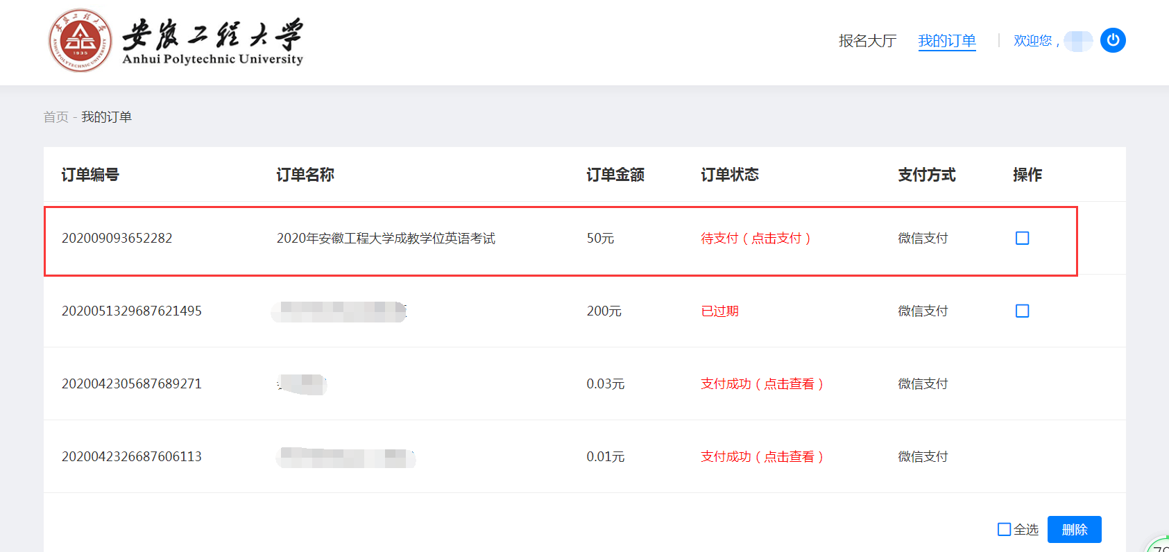 已支付完成的缴费信息及缴费详情可在“我的订单”中查询: