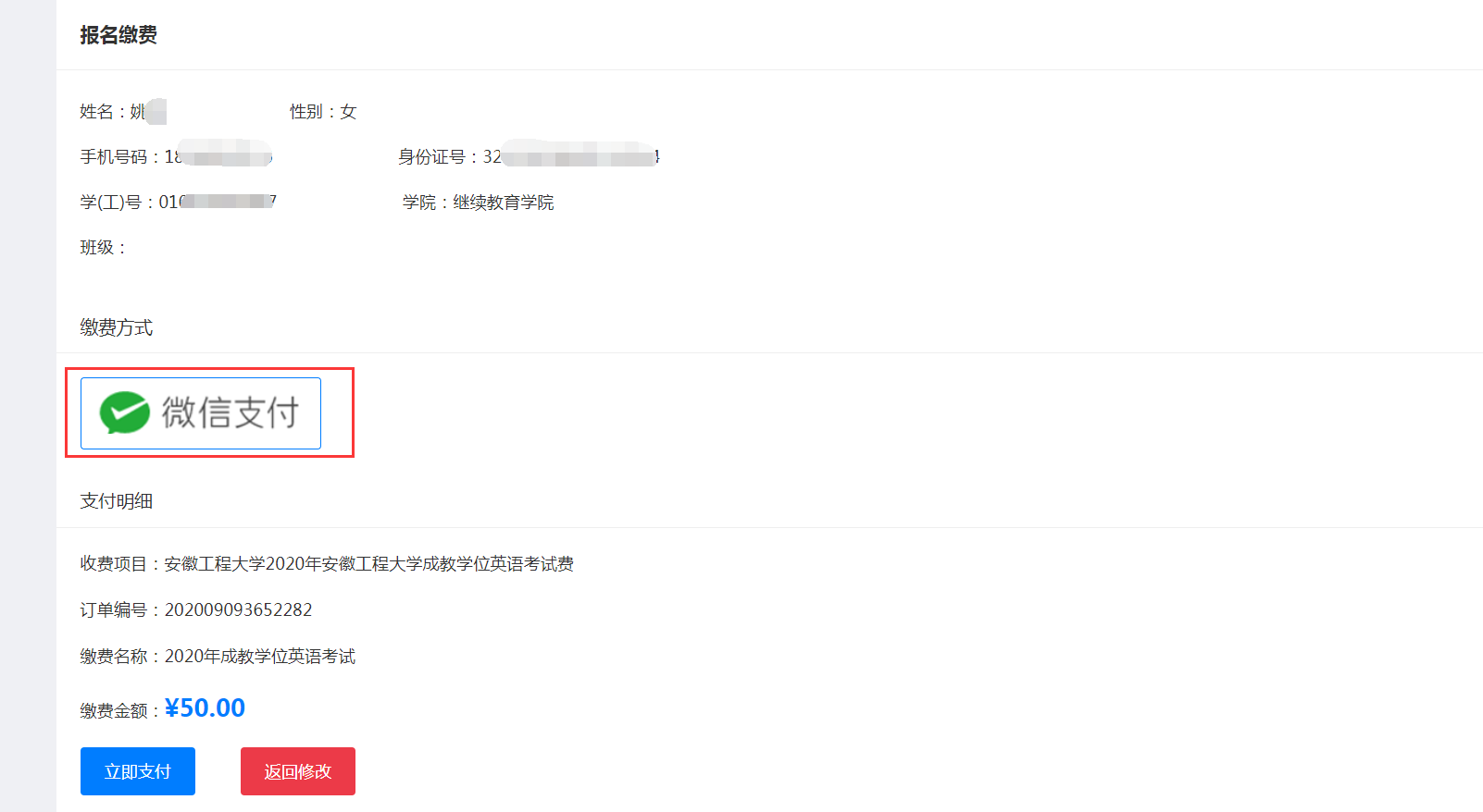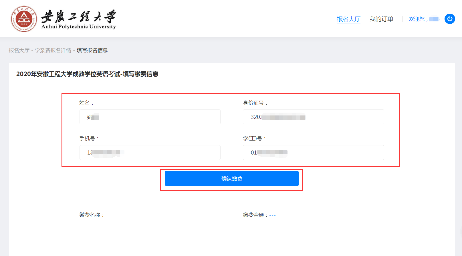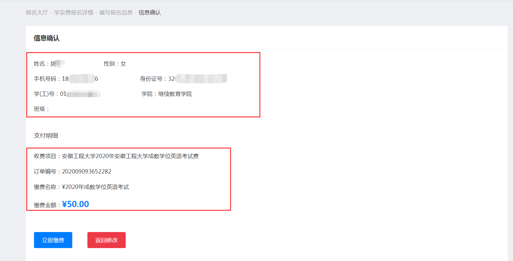 核对个人姓名,身份证号,手机号,学号,缴费项目,缴费金额等。确认无误,点击“确认缴费按钮”:
