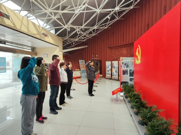 “我志愿加入中国共产党,拥护党的纲领,遵守党的章程,履行党员义务,执行党的决定,严守党的纪律,保守党的秘密,对党忠诚,积极工作,为共产主义奋斗终身,随时准备为党和人民牺牲一切,永不叛党!”在烈士陵园纪念馆大厅,面对鲜艳的中国共产党党旗,公司党支部全体党员高举右拳,重温入党誓词,铮铮誓言响彻纪念馆。