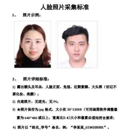 根据公司安排,校园门禁系统采用面部识别的方式予以通行,为保证大家能够正常出入,现收集人脸信息,请同学们按要求提供。因未提供电子照片或电子照片不符合要求无法进入校园参加教学活动的,按旷课处理。